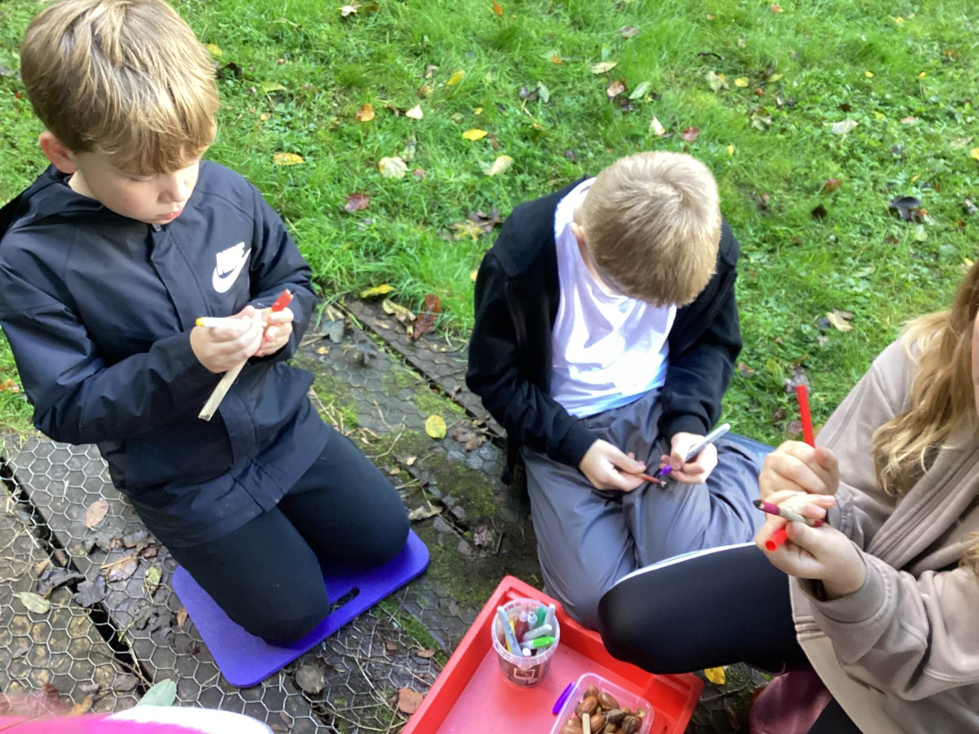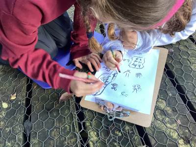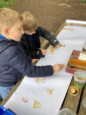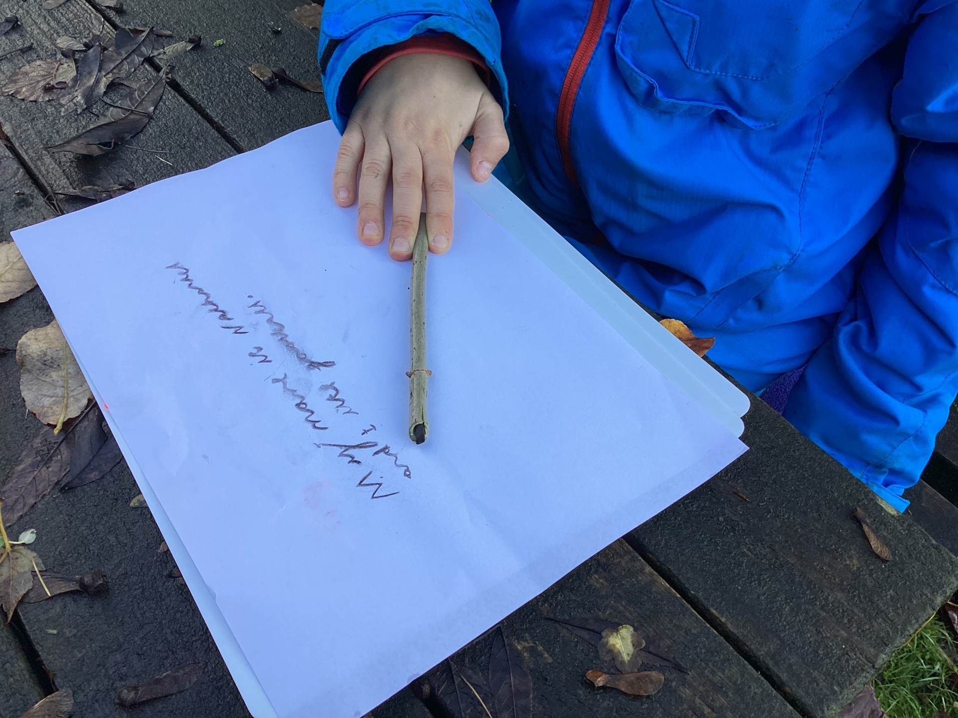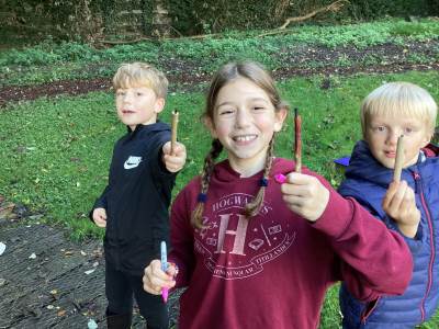 Forest School Session 4 - 22.10.2025 - We had a super final Forest School session today. We used natural materials to make a lean-to shelter, using a horizontal elder branch as a support. Some of us enjoyed using cut stems from the elder to create pencils- we used tent pegs to push the soft pith inside the stems and then found some charcoal to fit in the gap. We then decorated our pencils.