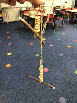We put up the shelter in the base area to protect us from the drizzle and we made some natural bird feeders using sticks, twine and cheerios!