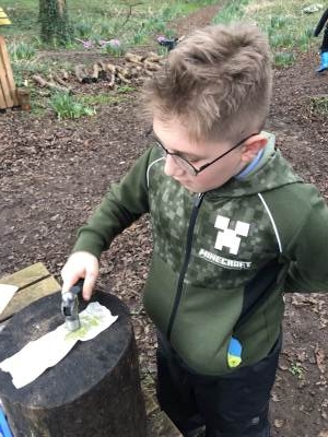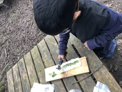 - To celebrate the Year of Reading, we started a project to make bookmarks using the Japanese Hapa-zome 'flower pounding' art technique. We used hardy winter herbs (sage, rosemary and mint). We will carry on with this project in our next sessions.