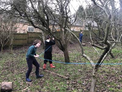 - using overhand knots to create rope obstacle courses in the orchard area and guiding a partner along it